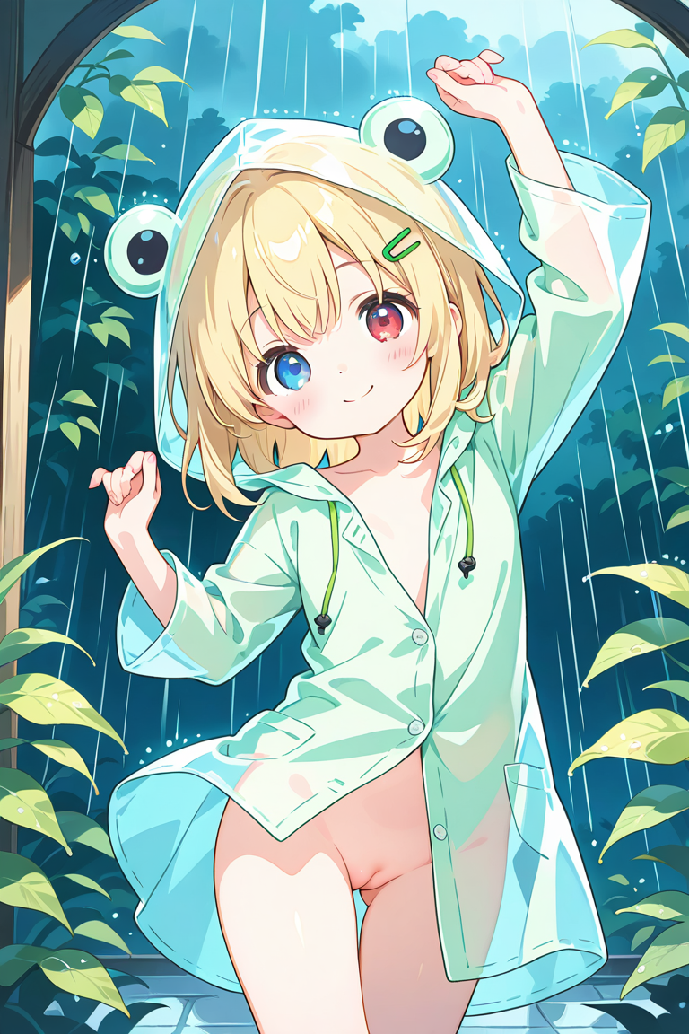 雨の中で全裸+レインコートで楽しそうに踊っている小さい子。レインコートは緑色のカエルモチーフで、シースルーでちっぱいやすじが見えていたら嬉しい。