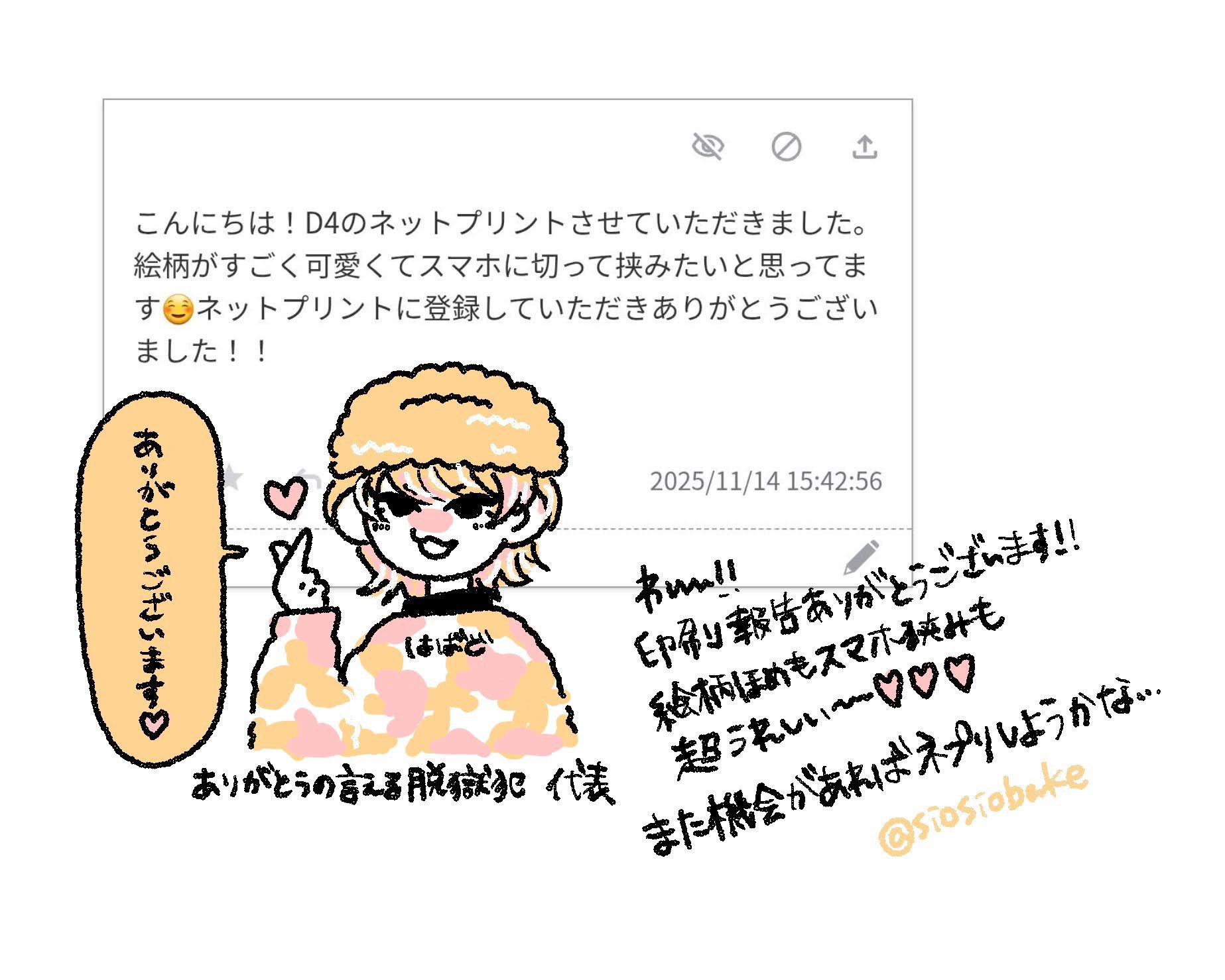 こんにちは!D4のネットプリントさせていただきました。絵柄がすごく可愛くてスマホに切って挟みたいと思ってます☺️ネットプリントに登録していただきありがとうございました!!