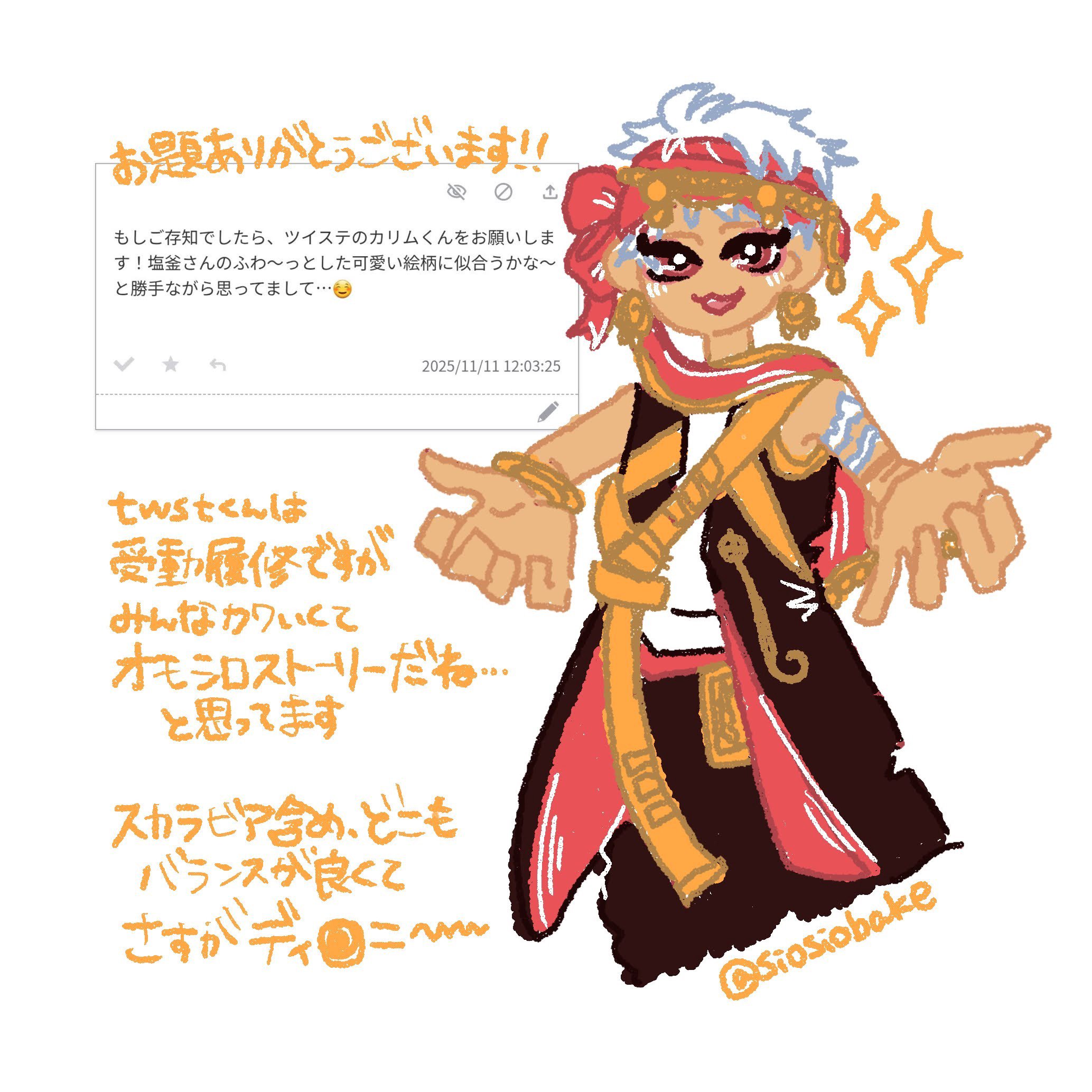もしご存知でしたら、ツイステのカリムくんをお願いします!塩釜さんのふわ〜っとした可愛い絵柄に似合うかな〜と勝手ながら思ってまして…☺️