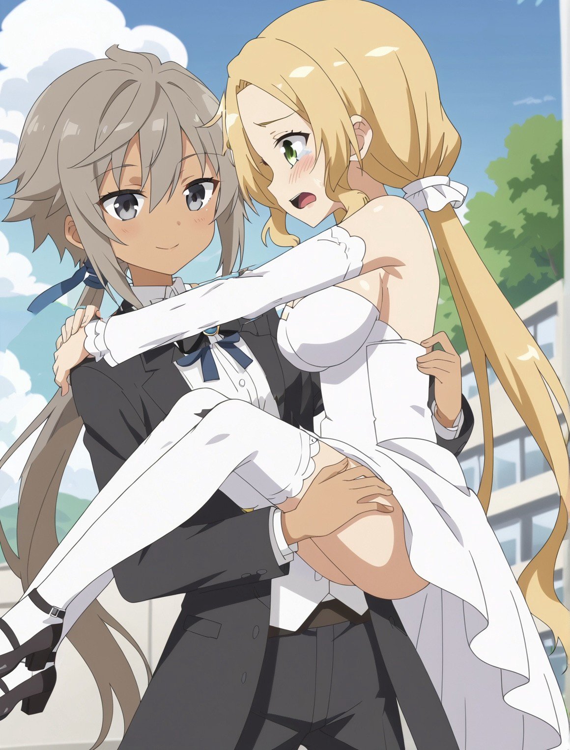 ウェディングドレスを着た風をお姫様抱っこする棗(タキシード着用)をお願いします