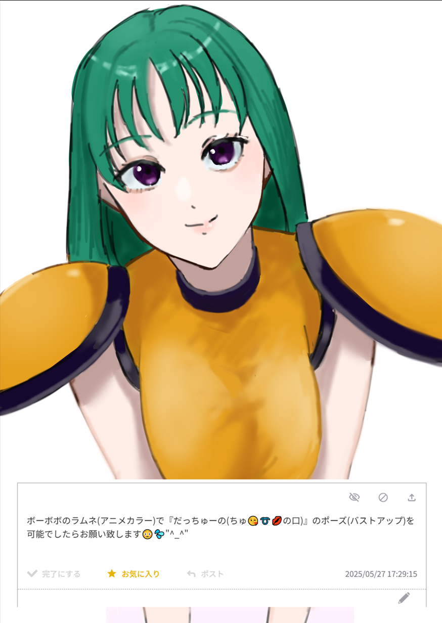 ボーボボのラムネ(アニメカラー)で『だっちゅーの(ちゅ😘➰💋の口)』のポーズ(バストアップ)を可能でしたらお願い致します😳💦"^_^"