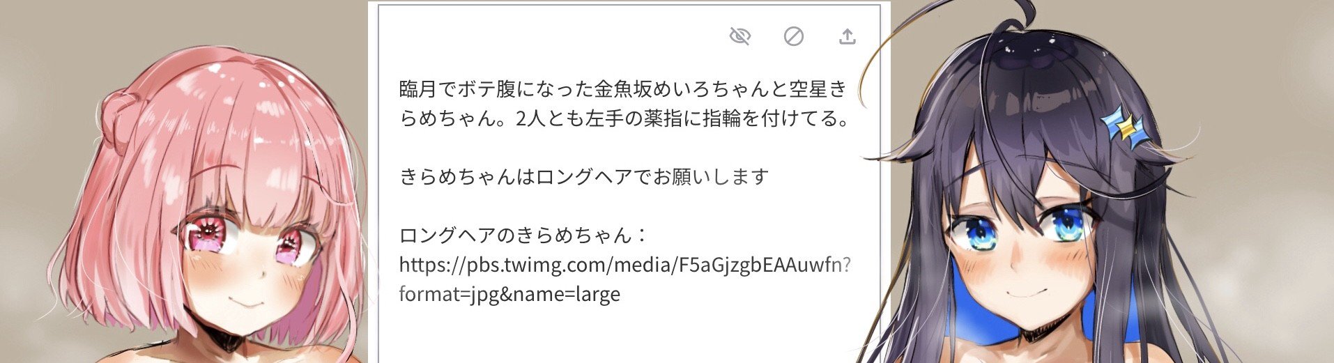 臨月でボテ腹になった金魚坂めいろちゃんと空星きらめちゃん。2人とも左手の薬指に指輪を付けてる。