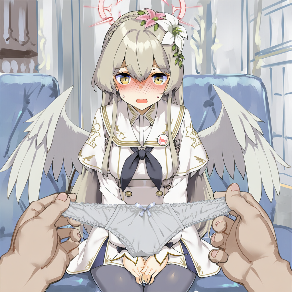 ブルーアーカイブのナギサちゃんの剥ぎ取り純白おパンツ本人の目の前で広げられちゃうやつみたいです!おパンツのリボンが正面に来る構図でお願いします!