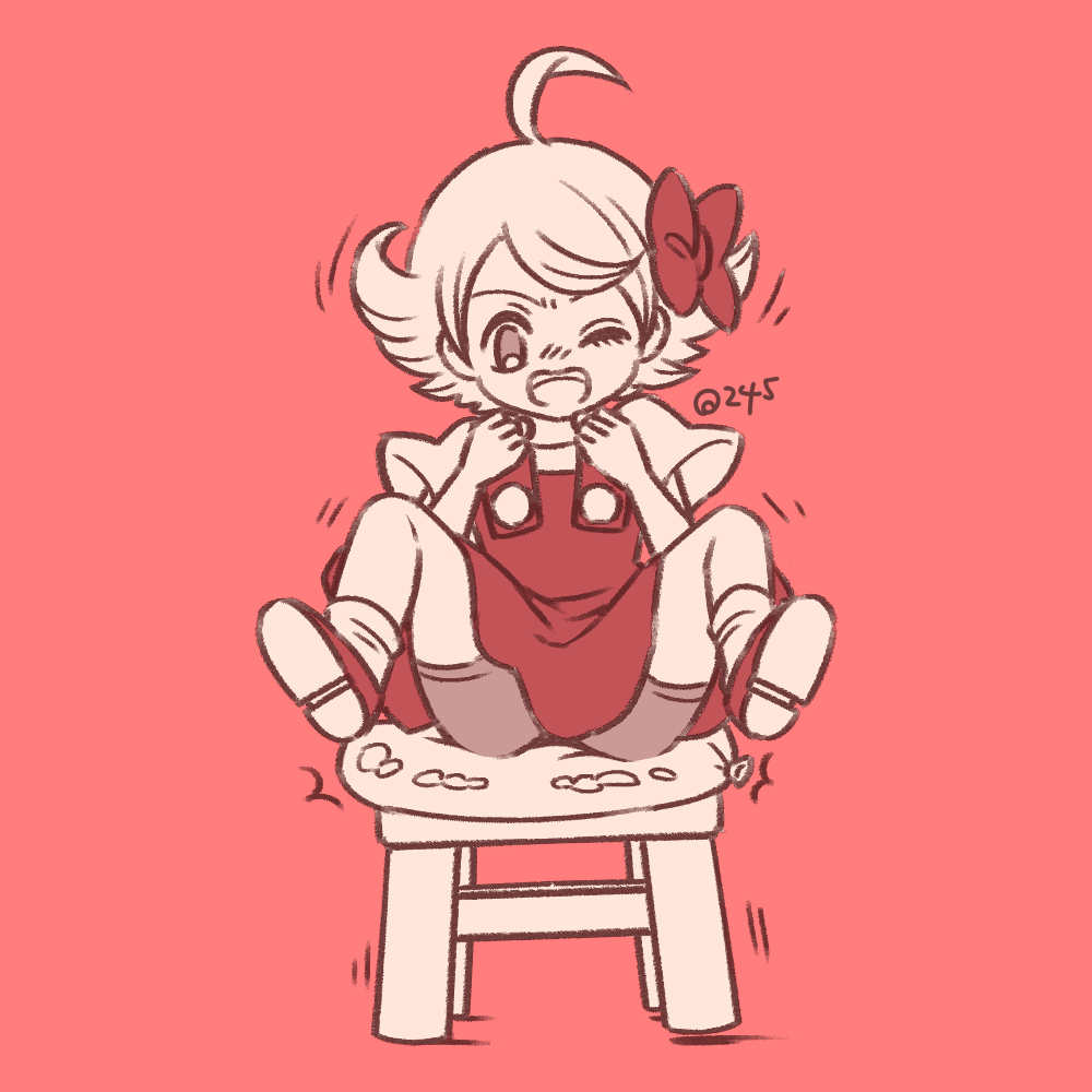 バルーンファイトGBのアリスが椅子に置かれた風船をお尻で割るイラストを描いて下さい。