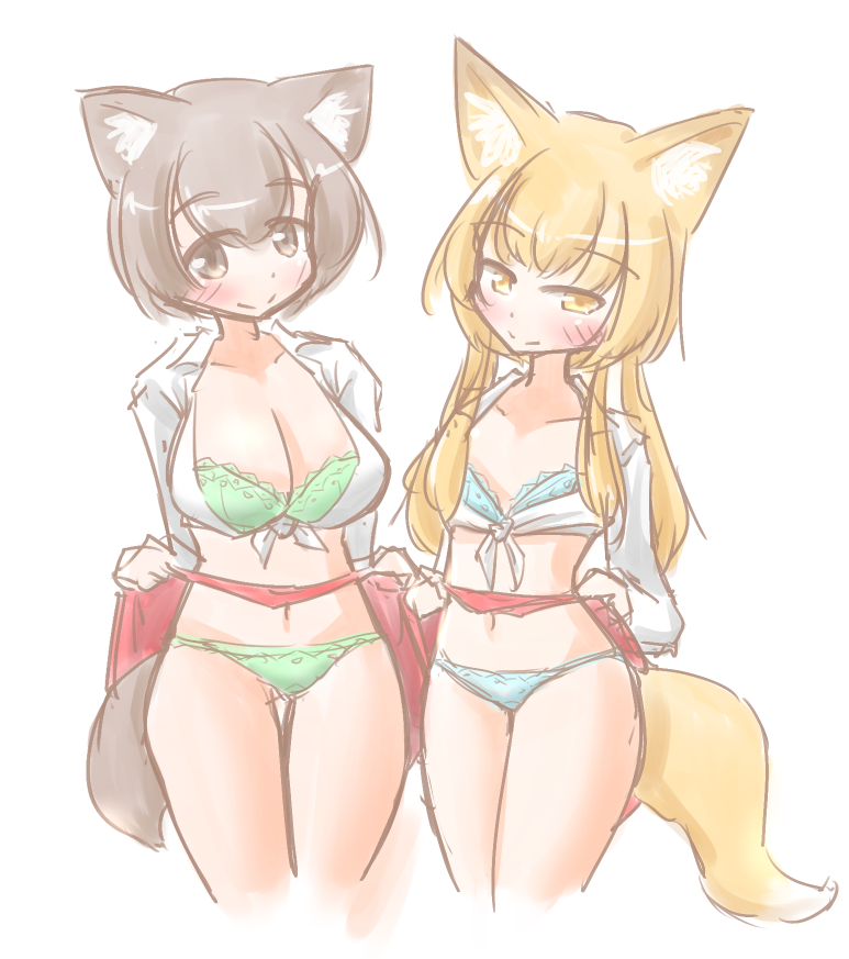 伺かゴースト「きつねとたぬき」のたまもちゃんとぽんちゃんが、アメスク衣装のスカートたくしあげで中身を見せてくれるところをお願いします。