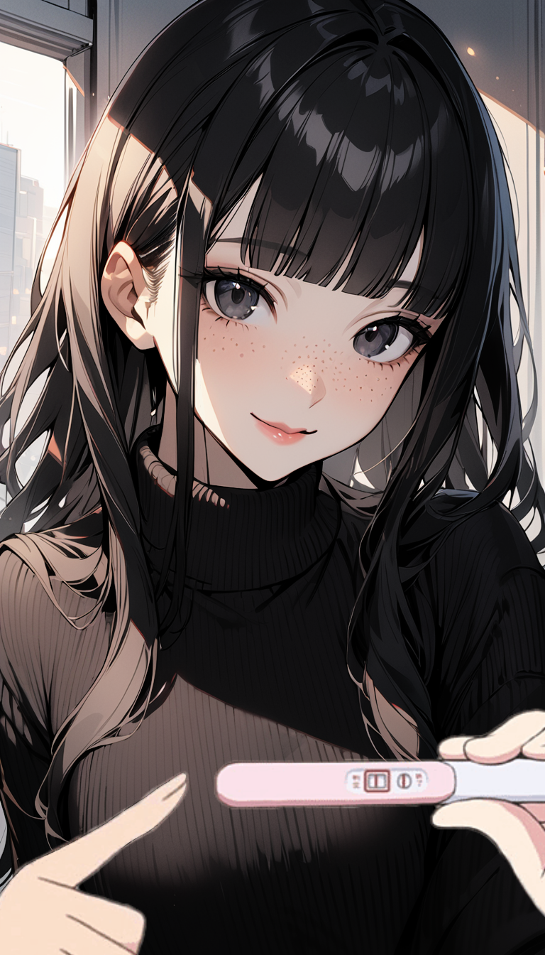 おめでたなことが分かり、嬉しそうに妊娠検査薬を見せてくるお姉さんをお願いできますか?