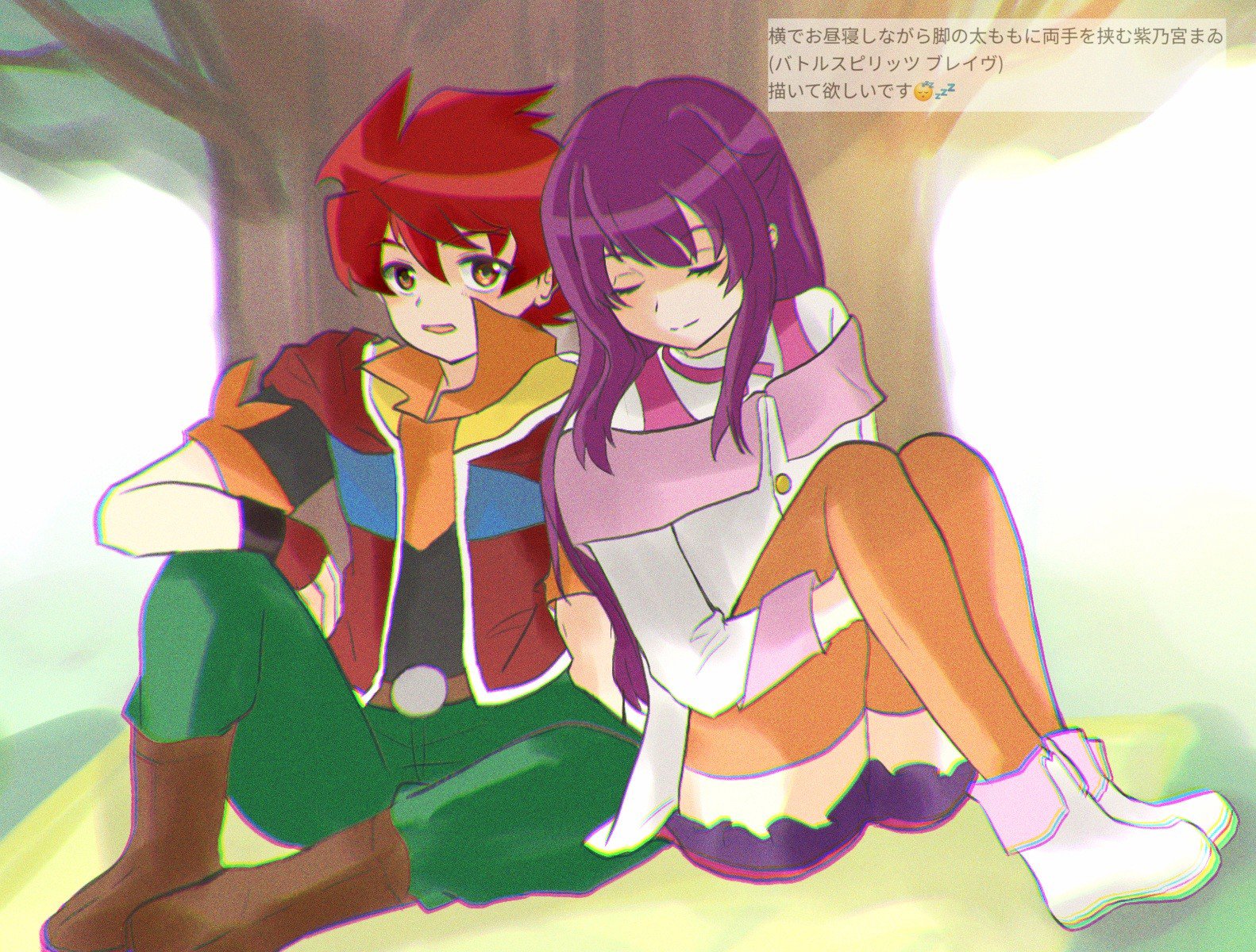 横でお昼寝しながら脚の太ももに両手を挟む紫乃宮まゐ (バトルスピリッツ ブレイヴ)
