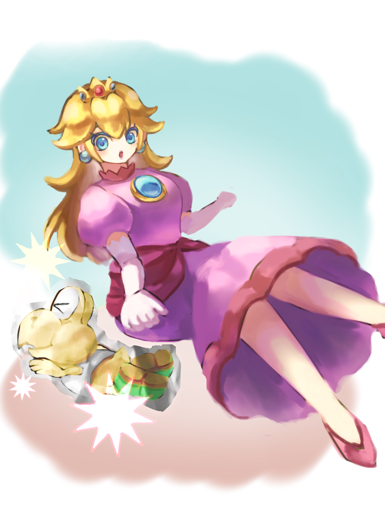 スーパーマリオのピーチ姫がうつ伏せのハダカガメ(踏まれてコウラから飛び出たランニングに短パン姿のノコノコ)をヒップドロップで踏み潰して全身を紙みたいにペラペラに潰しているところをお願いします!