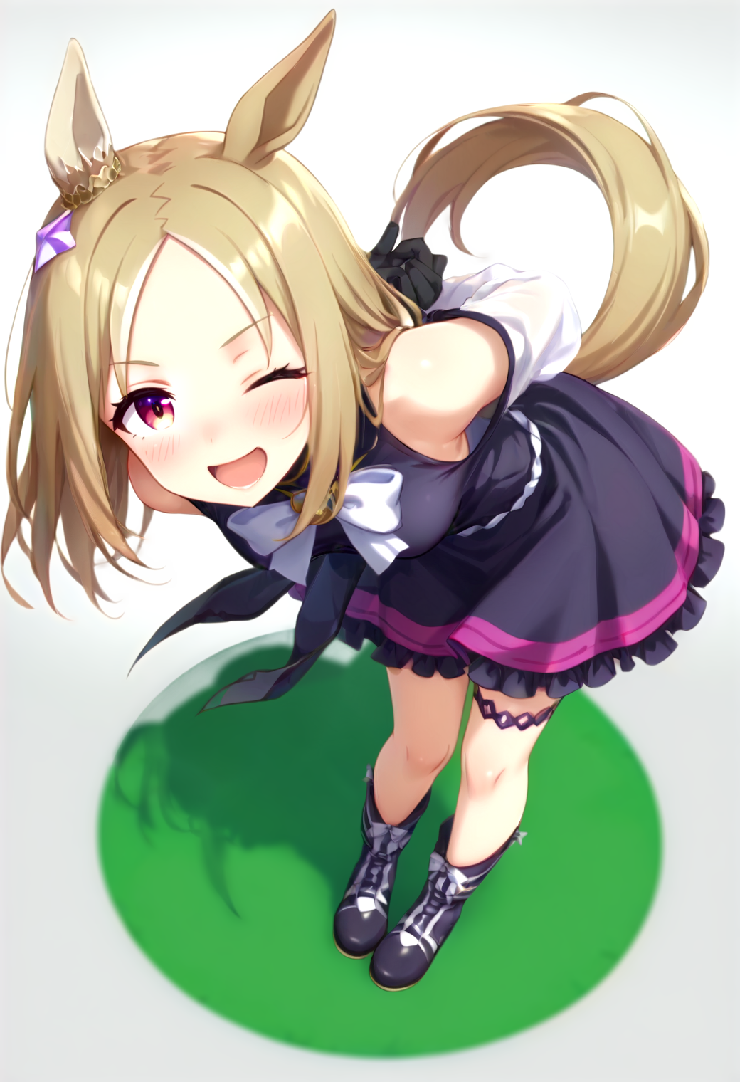 ウマ娘のナリタトップロードが勝負服を着てる状態で両手を後ろや頭の上に組んでこちらにおっぱいを強調して見せつけてるようなイラストをお願いします