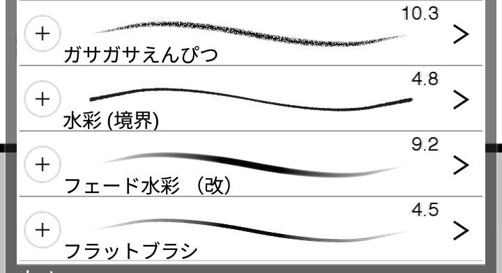 上からラフ用、線画用、描き込み用、ほぼ全部の塗り用で使ってます!フェード水彩は入りぬきと濃さを自分でカスタムしたやつで、フラットブラシは配布から頂戴したものです🙇♀