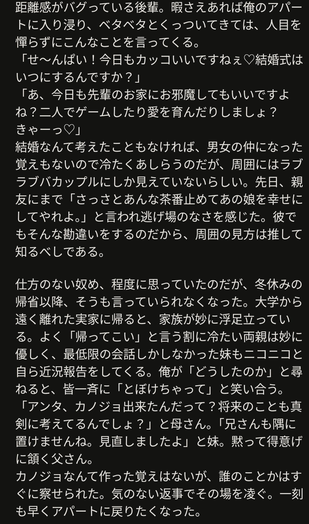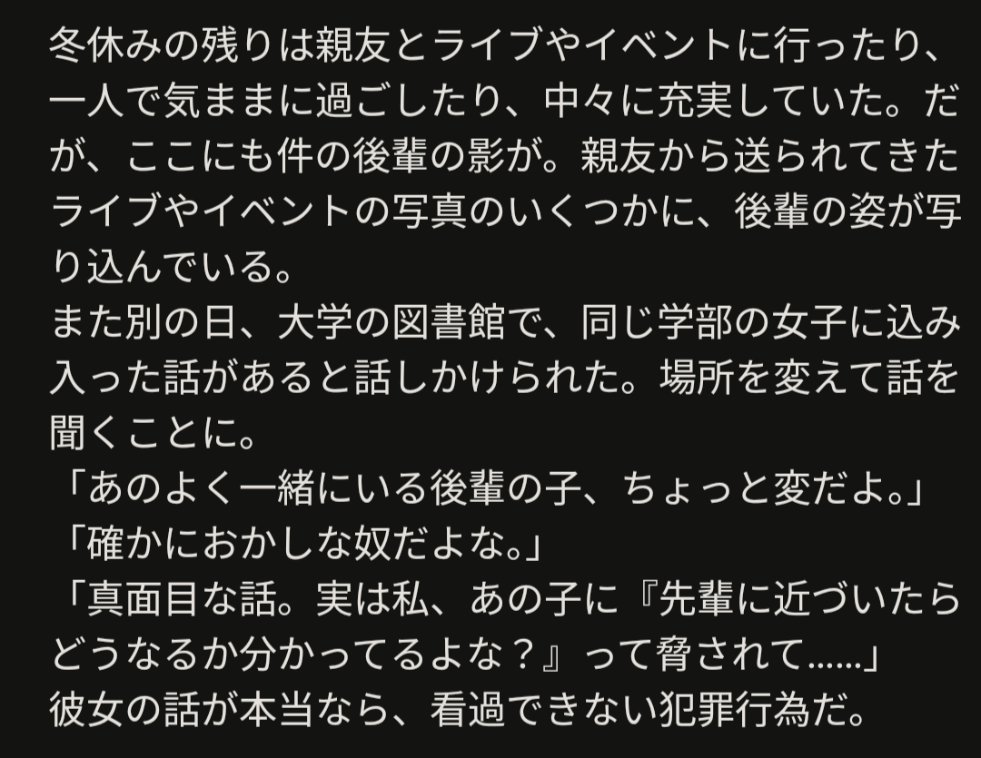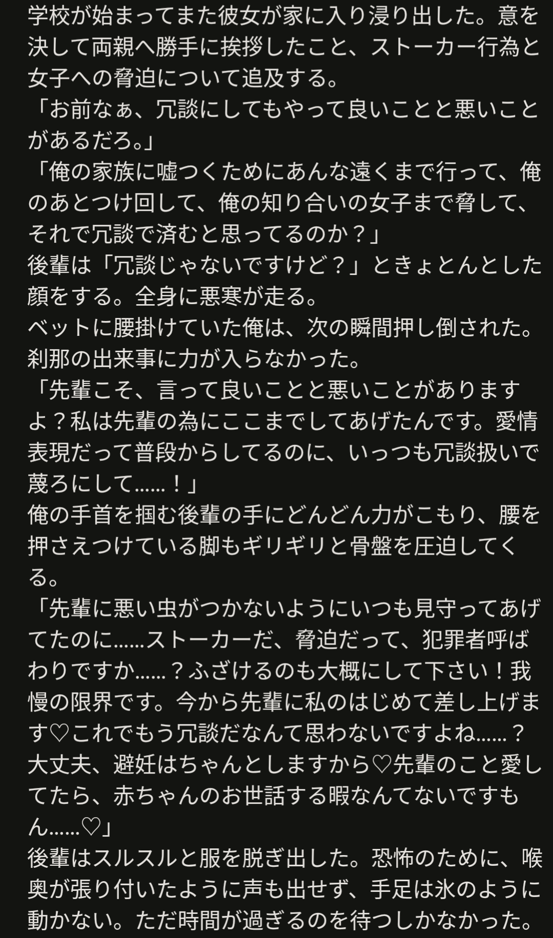 ほぼ外堀を埋めている後輩ちゃん。知らない間に両親の挨拶も済ませ、周りの人も2人が付き合うものだと思っている。ところがある日、自分のやっていたこと(ストーカー、恋敵の排除etc)がバレてしまう。問い詰められるが、鈍感な貴方に逆ギレ、押し倒す。そのままゴリ押しで貴方を自分のものにする。