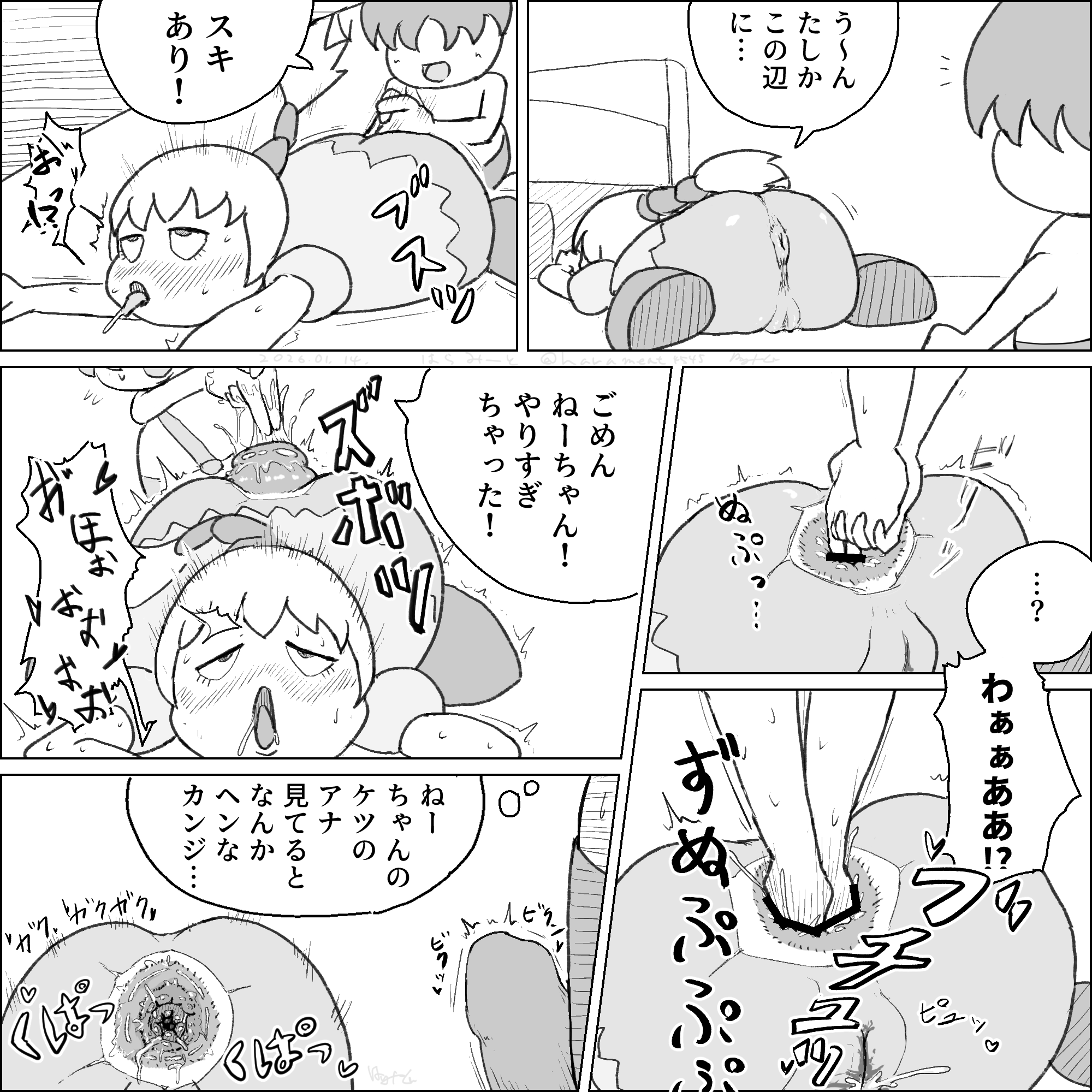 アニメ版星のカービィのフームが弟のブンに悪戯でカンチョーされるイラストをお願い出来ますでしょうか?